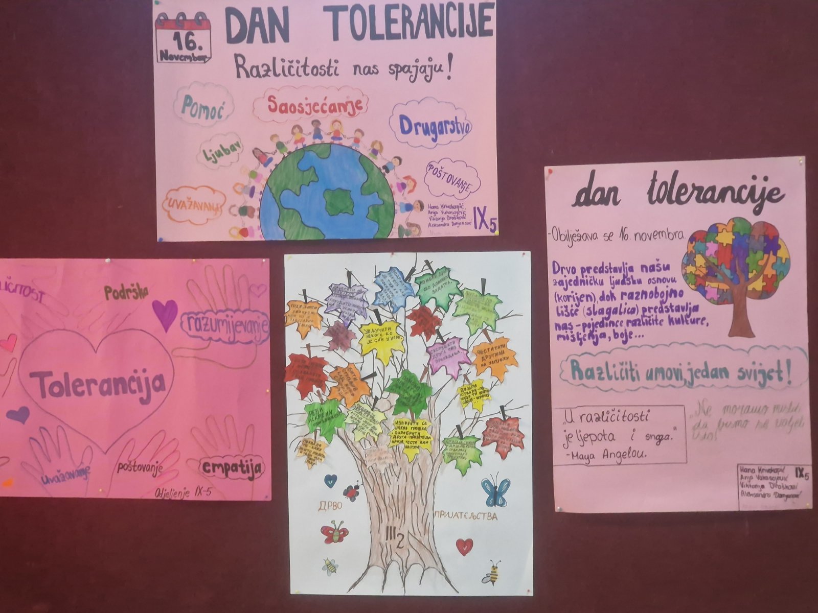 Odjeljenske zajednice naše škole na čelu sa svojim odjeljenskim starješinama su od 16.novembra i u danima koji su uslijedili obilježili Dan tolerancije pod sloganom: “Tolerancija-naš most ka obali razumijevanja”.